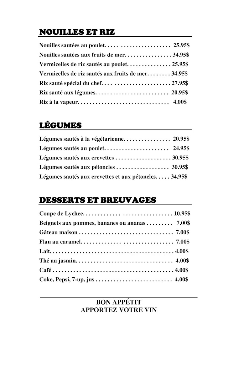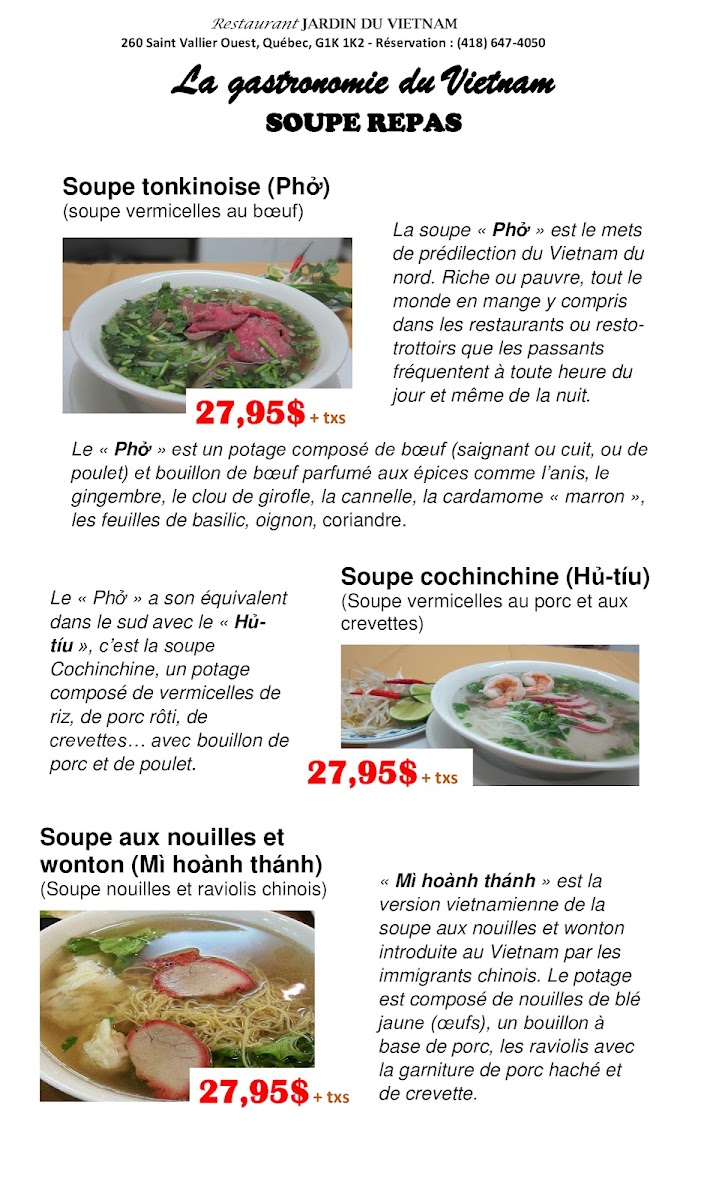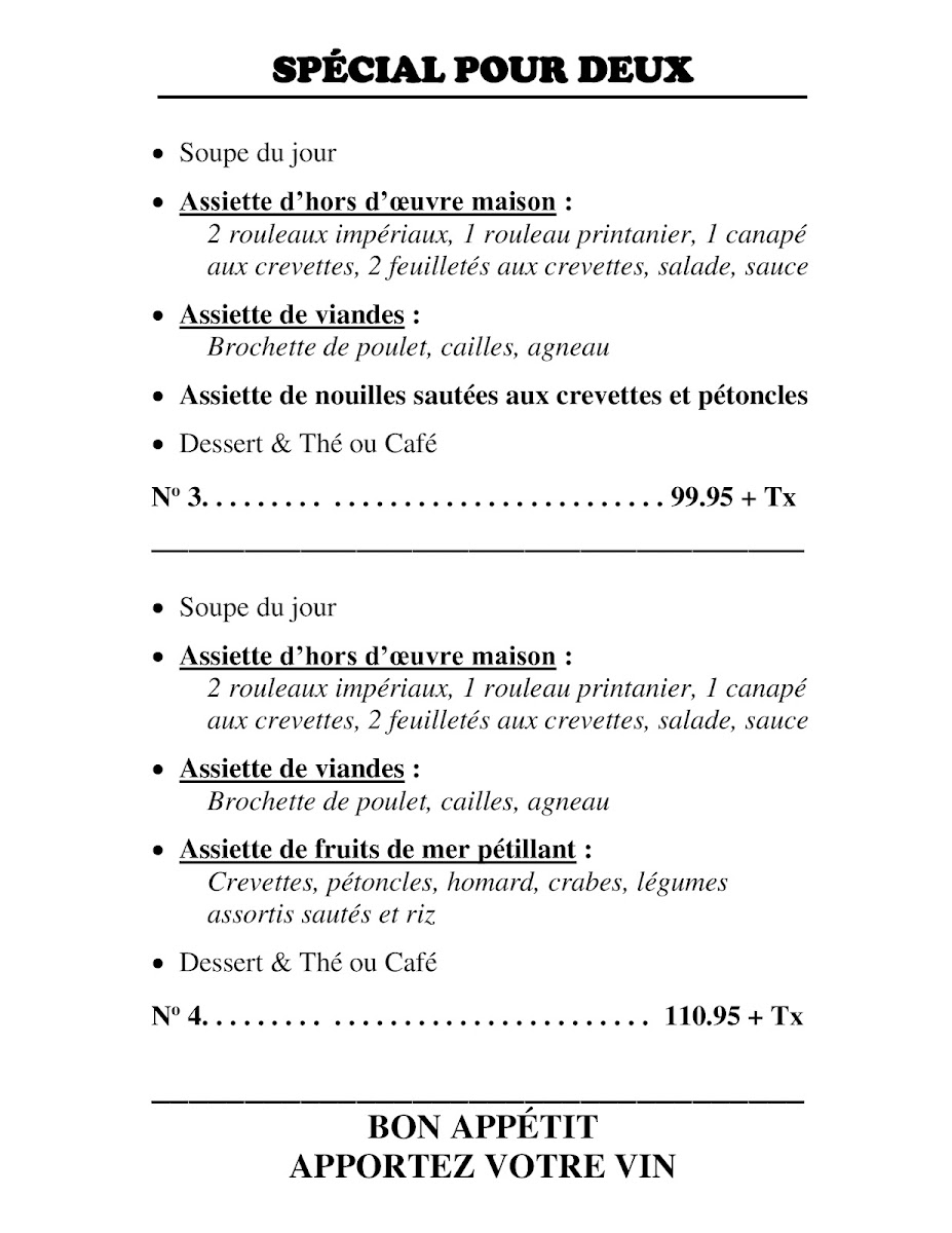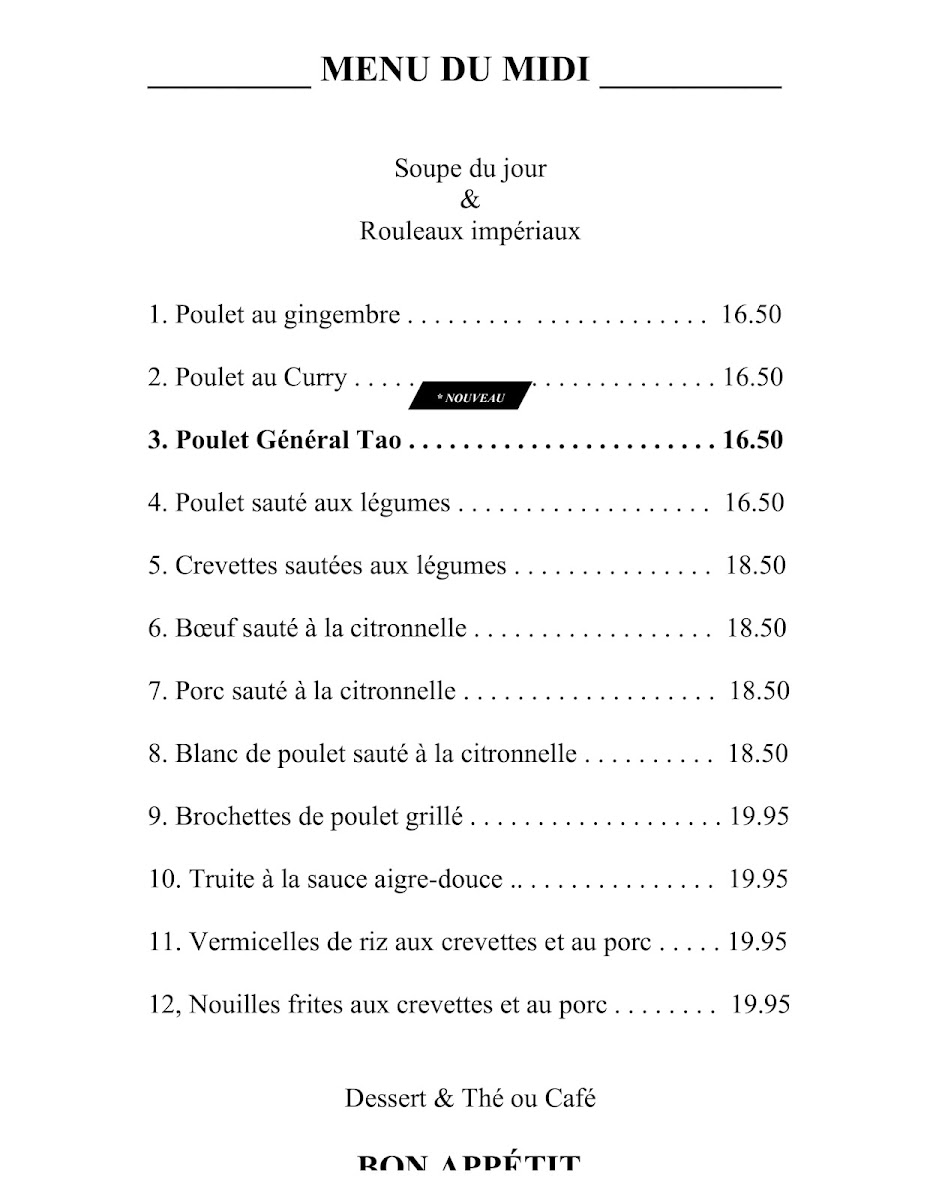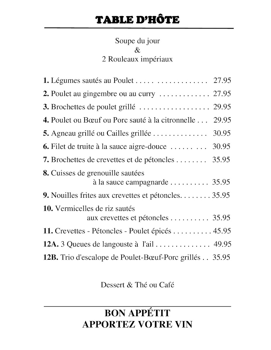 The menu at Vietnam Garden is a feast for the senses, showcasing the richness of Vietnamese cuisine. Highlights include the Poulet General Tao, offering a flavorful twist on the classic dish, and Filets mignons that promise a succulent and satisfying experience. For those looking for a complete dining experience, the Menu Table d'hote provides a satisfying full-course meal that begins with comforting chicken soup and progresses to delicious spring rolls, followed by a personalized main course choice.