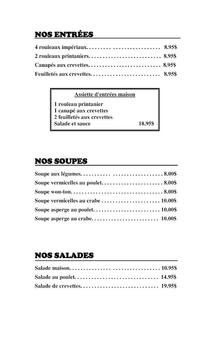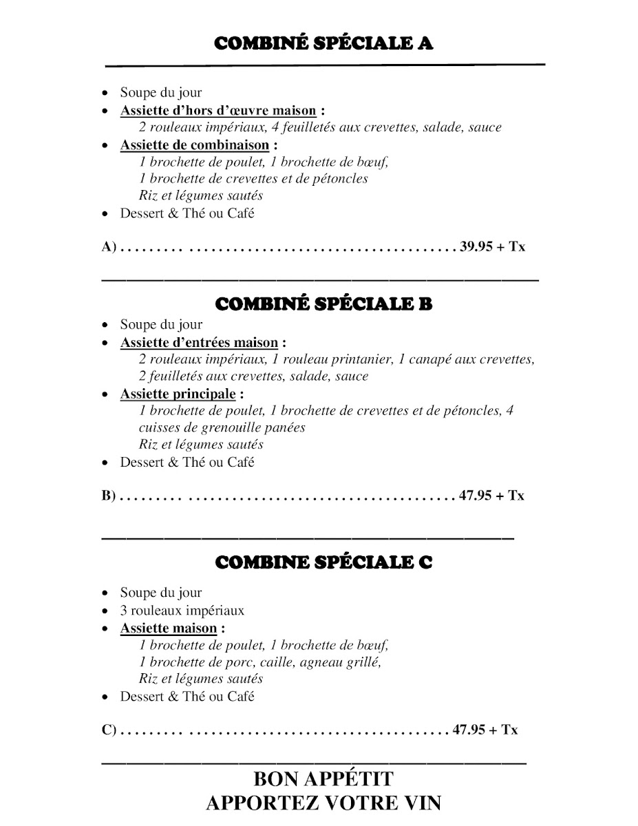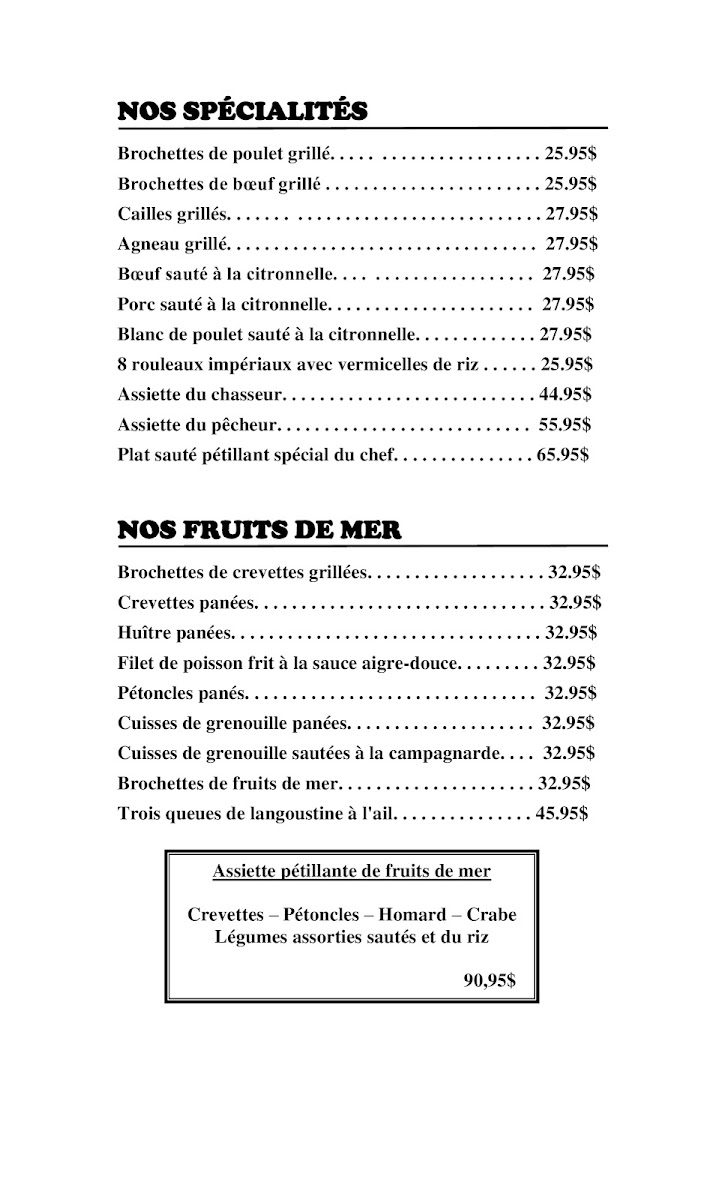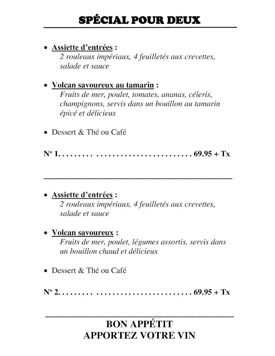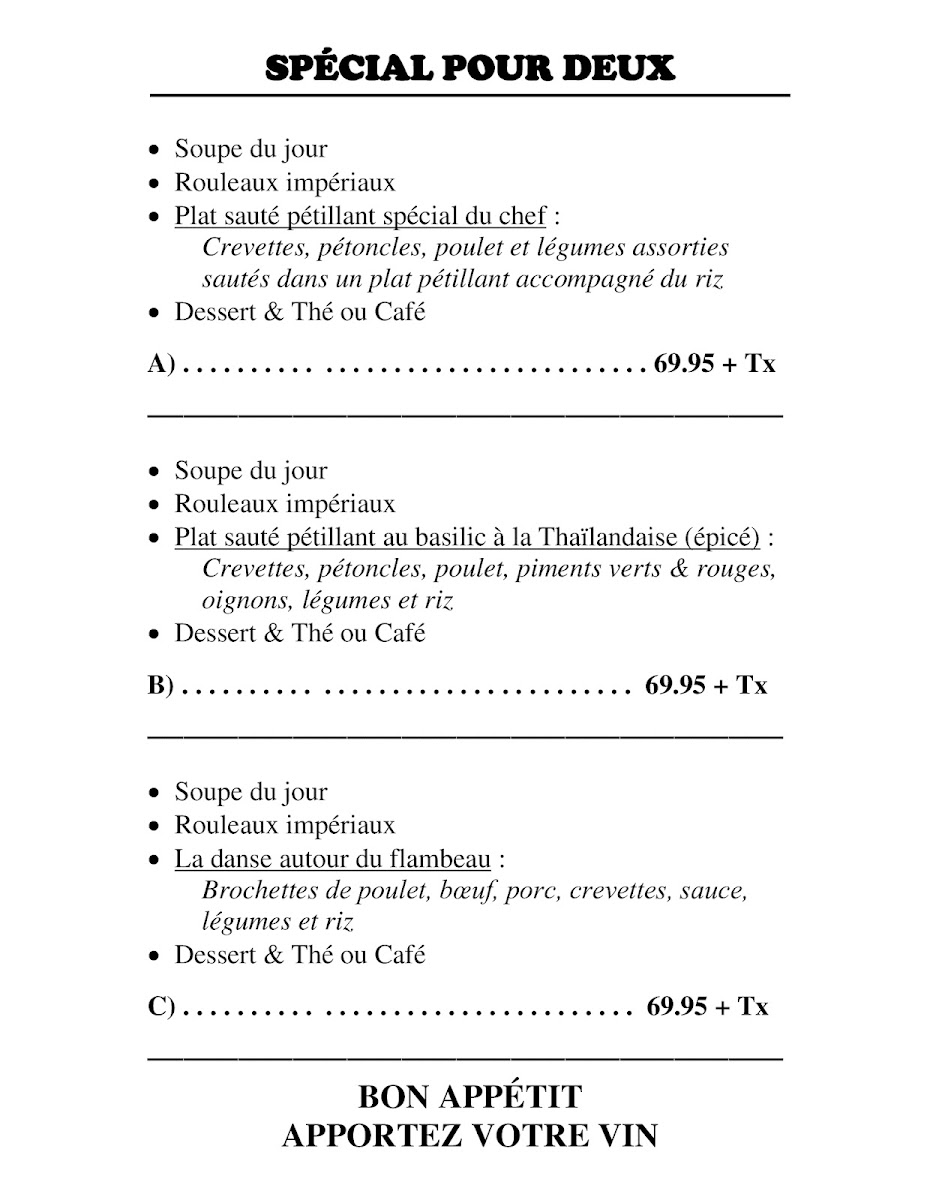 The menu at Vietnam Garden is a feast for the senses, showcasing the richness of Vietnamese cuisine. Highlights include the Poulet General Tao, offering a flavorful twist on the classic dish, and Filets mignons that promise a succulent and satisfying experience. For those looking for a complete dining experience, the Menu Table d'hote provides a satisfying full-course meal that begins with comforting chicken soup and progresses to delicious spring rolls, followed by a personalized main course choice.